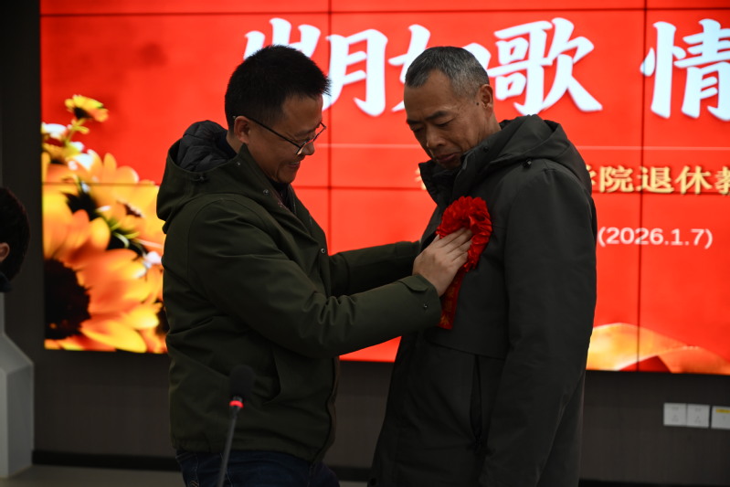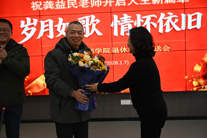 紧接着,麻丽娟书记上台为龚老师送上精心创作的退休赠诗,诗句凝练了龚老师的从教初心与育人成就,饱含着学院对他的崇高敬意。随后,今天的主角龚益民老师在全场掌声中登台,麻丽娟书记与蒋金伟院长共同为他献上鲜花与荣休绶带,鲜花象征着岁月沉淀的芬芳与敬意,绶带承载着学院的认可与牵挂,这一刻成为仪式中最温馨的定格。