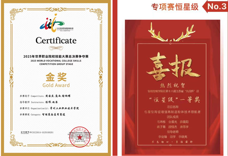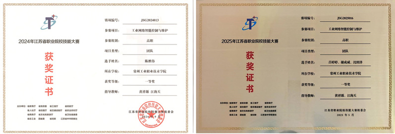 学生积极参加各类技能技术比赛,获得2025年世界职业院校技能大赛总决赛争夺赛智能装备应用赛道国赛金奖、江苏省“挑战杯”大学生课外学术科技作品“恒星级”一等奖、江苏省职业院校技能大赛“工业网络智能控制与维护”一等奖等。